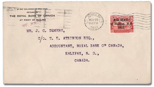 Airmail, 1921, 35¢ "Halifax", narrow "AIR MAIL", with period after "1921" (Scott C3h), tied by a St. Johns machine cancel, Nov 25, 1921, on a cover intended to be flown from Botwood to Halifax; after prolonged delays the flight was abandoned and mail was carried by train to Halifax where it was backstamped on Feb 4, 1922, Very Fine. Scott $260. (Image)