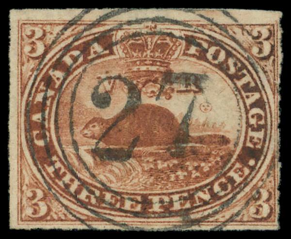 1852, 3d red (Scott 4), ringed '27' cancel, Fine. Scott $200. (Image)