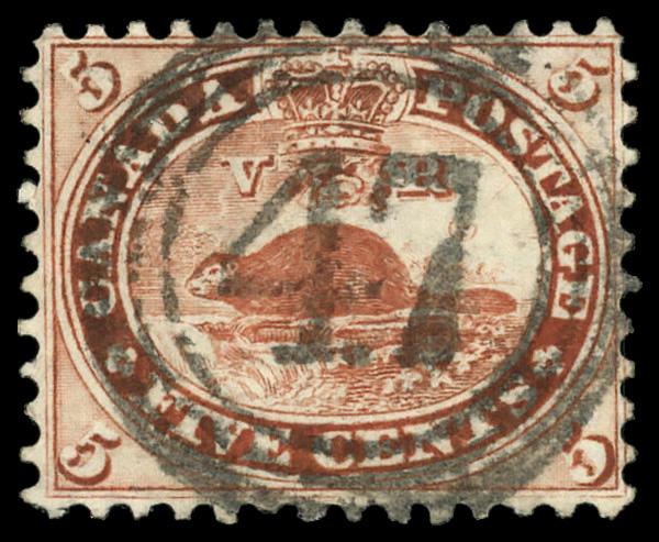 1859, Beaver, 5¢ vermilion (Scott 15), 'Three Rivers' #47 cancel, Fine to Very Fine. Scott $38. (Image)
