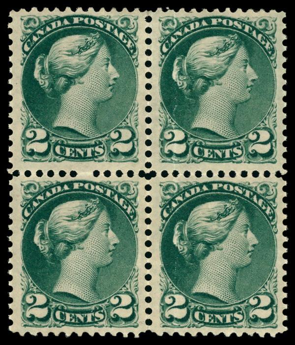 1872, Small Queen, 2¢ green (Scott 36), block of 4, o.g., lightly hinged; vertical crease on 2 left stamps, Extremely Fine. Scott $280. (Image)