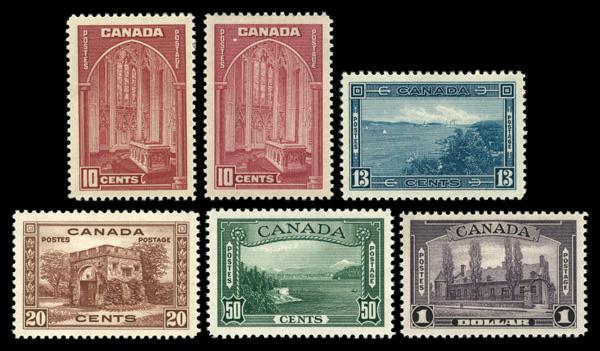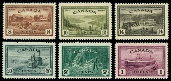 1946, King George VI "Peace" definitives, 8¢ to $1 complete (Scott 268-273), o.g., some never hinged / some hinged, Very Fine. Scott $89. (Image)