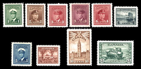 1942-43, King George VI "War" definitives, 1¢ to $1 & airmails, complete (Scott 249-262 & C7-C8), set of 16, o.g., never hinged (4c, 50c, $1 & airmails lightly hinged), Very Fine to Extremely Fine. Scott $134. (Image)