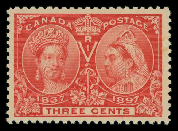 1897, Queen Victoria Jubilee, 3¢ bright rose (Scott 53), o.g., never hinged, Very Fine. Scott $75. (Image)