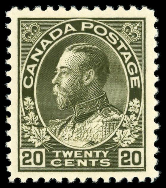 1925, King George V "Admiral", 20¢ olive green, dry printing, retouched (Scott 119), o.g., lightly hinged, Fine to Very Fine. Unitrade 119iv; C$70 ($50). (Image)