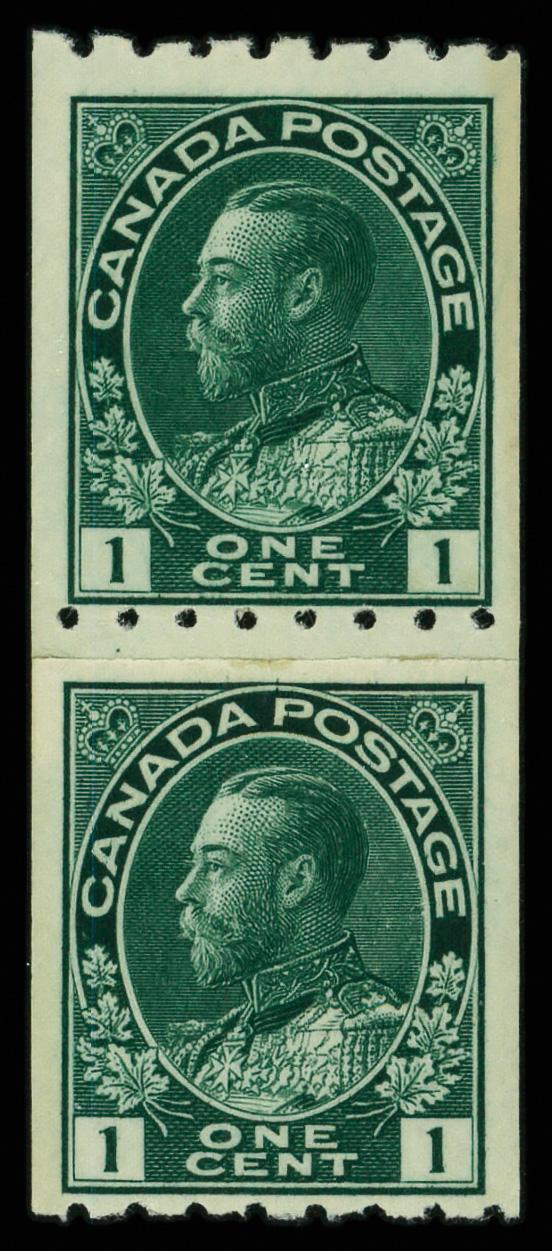 1913, King George V "Admiral" coil, 1¢ dark green, perf. 8 horizontally (Scott 123), paste-up pair, o.g., hinge remnant (1 stamp never hinged), Fine. Scott $300. (Image)