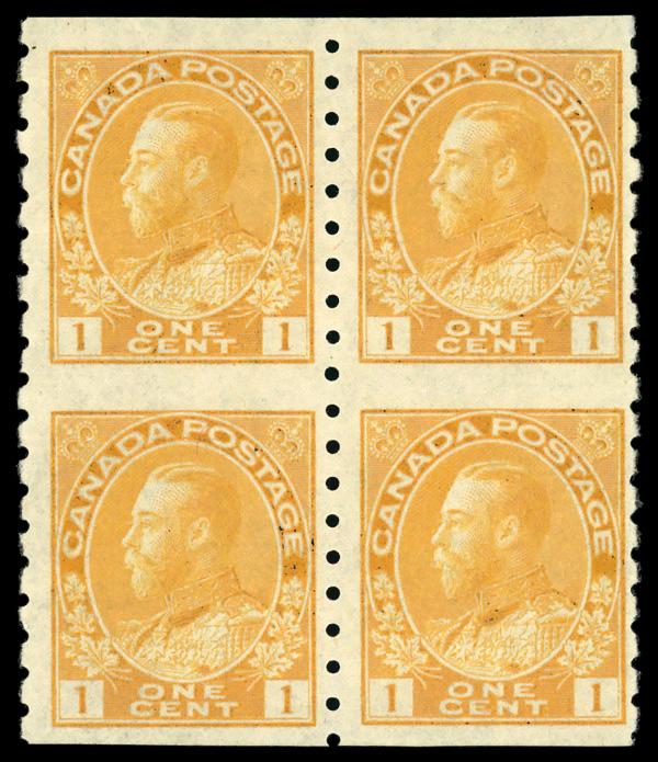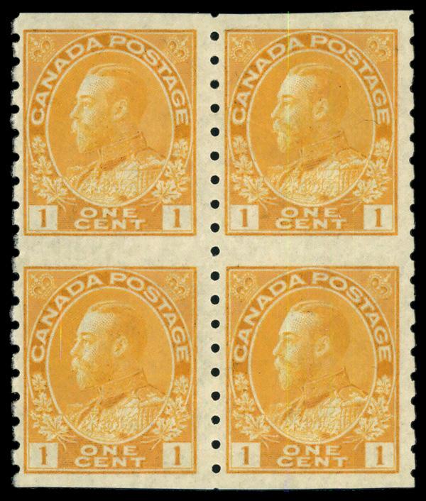 1923, King George V "Admiral" coil, 1¢ yellow, Die I, wet printing, perf. 8 vertically, block of 4 (Scott 126c), o.g., hinged, Fine to Very Fine. Scott $700. (Image)