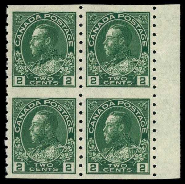 1922, King George V "Admiral" coil, 2¢ green, perf. 8 vertically, block of 4 (Scott 128a), disturbed o.g., Very Fine to Extremely Fine. Scott $55. (Image)
