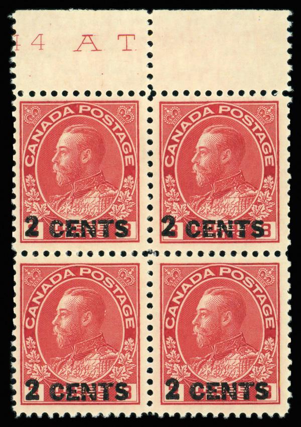 1926, King George V "Admiral", 2¢ on 3¢ carmine (Scott 139), top margin block of 4 with part imprint, o.g., never hinged, Fine to Very Fine. Scott $540. (Image)
