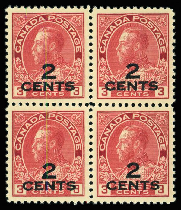 1926, King George V "Admiral", 2¢ on 3¢ carmine (Scott 140), block of 4, o.g., never hinged, Extremely Fine. Scott $250. (Image)