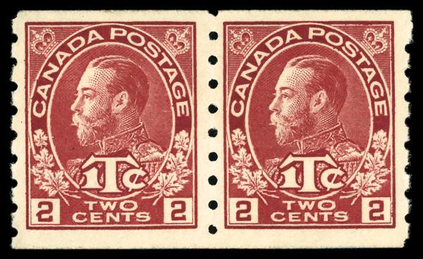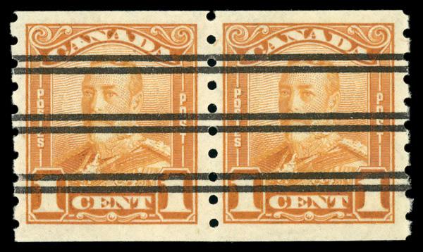 1929, King George V, 1¢ orange coil, precancel (Scott 160), pair, Fine to Very Fine. Unitrade 160xx; C$70 ($50). (Image)