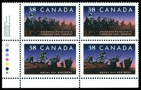 1989, 38c Infantry Regiments (Scott 1250), inscription block of 4, o.g., never hinged, Extremely Fine. Unitrade 1250ii; C$250 ($190). (Image)