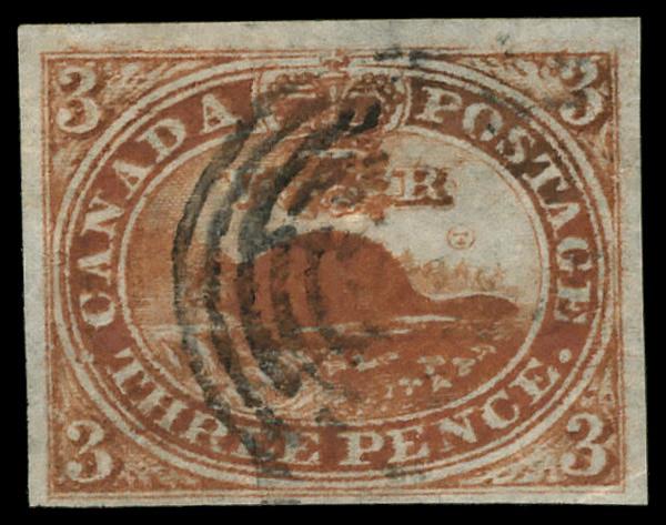 1852, Beaver, 3d red, on wove paper, imperforate (Scott 4), Very Fine. Scott $200. (Image)
