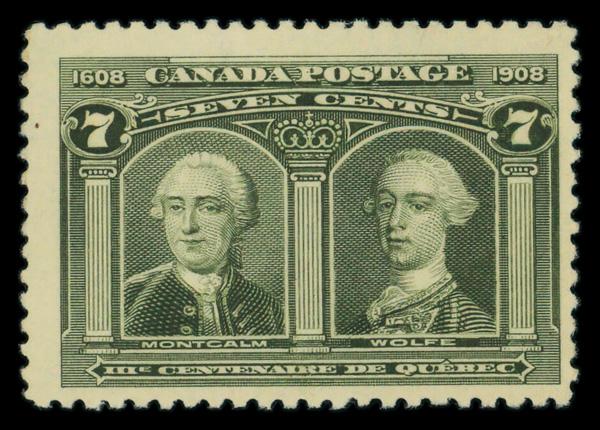 1908, 7¢ Quebec Tercentenary (Scott 100), o.g., lightly hinged, Fine to Very Fine. Scott $140. (Image)
