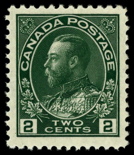 1923, King George V "Admiral", 2¢ green, dry printing (Scott 107e), o.g., never hinged, Very Fine to Extremely Fine. Scott $50. (Image)