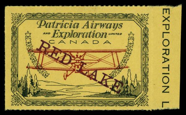 1926, Patricia Airways, descending purple 'RED LAKE' overprint (Scott CL30), right sheet margin single with part imprint, o.g., hinge remnant, Very Fine. Scott $65. (Image)