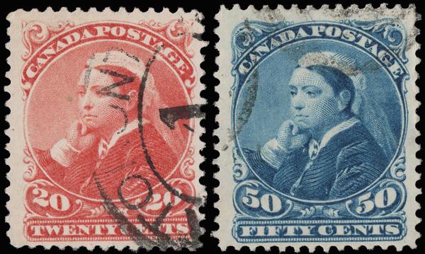 1893, Queen Victoria "Widow's Weeds", 20¢ vermilion and 50¢ deep blue (Scott 46-47). Scott $185. (Image)