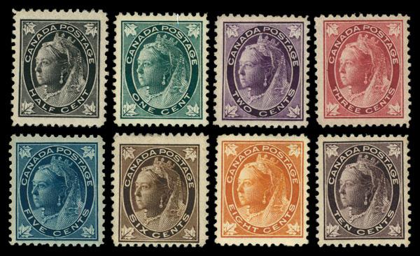 1897-98, ½c-10c Queen Victoria mapleleaf, complete (Scott 66-73), set of 8, o.g., lightly hinged or hinge remnant, Fine to Very Fine. Scott $1,460. (Image)