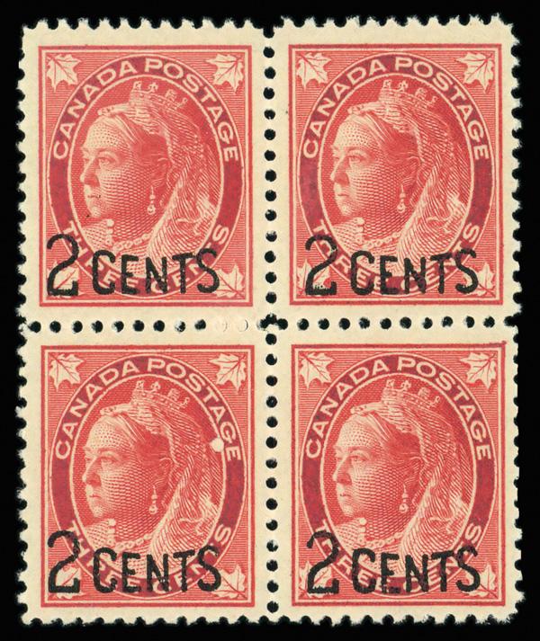 1899, Queen Victoria "Maple Leaf", 2¢ on 3¢ carmine (Scott 87), block of 4, o.g., never hinged, Very Fine. Scott $180. (Image)