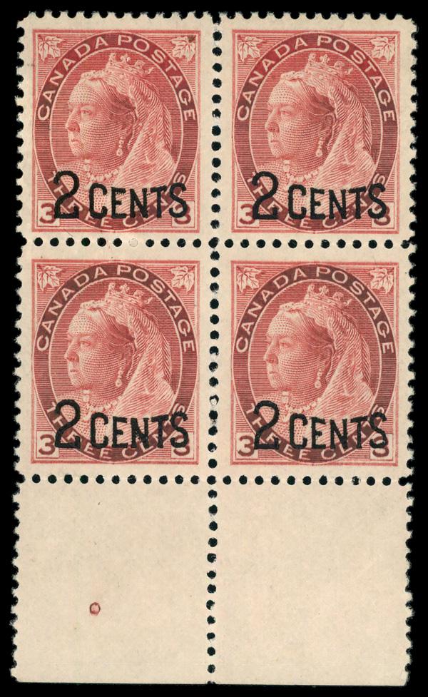 1899, 2c on 3c carmine Queen Victoria (Scott 88), bottom margin block of 4, o.g., slightly disturbed gum (1 stamp never hinged), Extremely Fine. Scott $180. (Image)