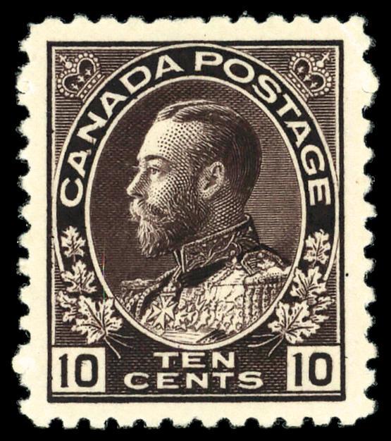 1912, King George V "Admiral", 10¢ plum (Scott 116), o.g., hinge remnant, Extremely Fine. Scott $275. (Image)