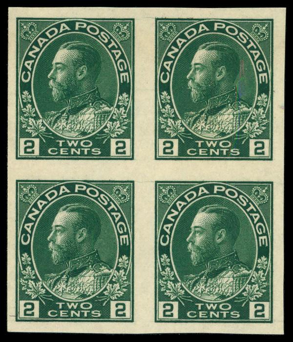 1924, 1c green King George V, imperf. (Scott 137), block of 4, o.g., never hinged, Very Fine to Extremely Fine. Scott $280. (Image)