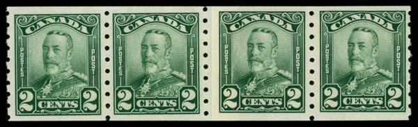 1929, King George V, 2¢ green coil (Scott 161), paste-up strip of 4, o.g., never hinged, Very Fine. Scott $200. (Image)