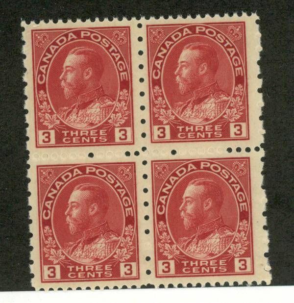 1931, King George V "Admiral", 3¢ carmine, perf 12x8 (Scott 184), block of 4, o.g., never hinged, Fine to Very Fine. Scott $20. (Image)