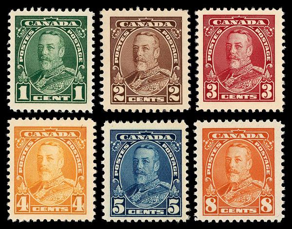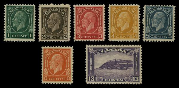 1932, King George V "Medallion" definitives, 1¢ to 13¢ complete (Scott 195-201), complete set of singles, o.g., never hinged, Fine to Very Fine. Scott $264. (Image)