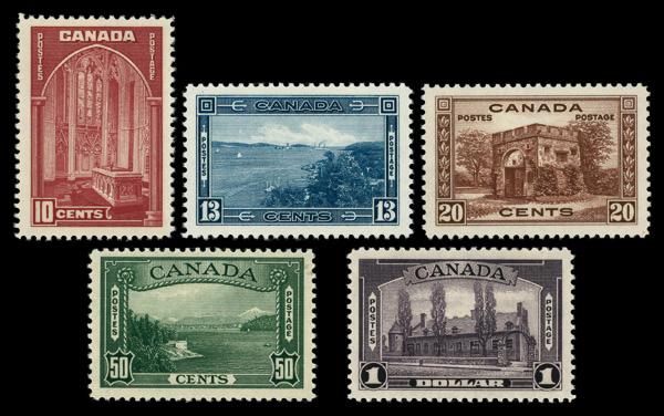 1938, Pictorial definitives, 10¢ to $1 complete (Scott 241-245), o.g., lightly hinged or hinge remnant, Extremely Fine. Scott $143. (Image)