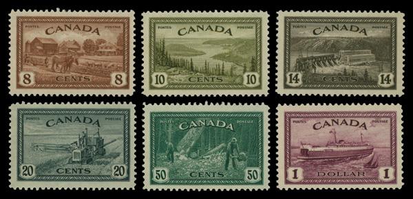 1946, King George VI "Peace" definitives, 8¢ to $1 complete (Scott 268-273), complete set of singles, o.g., never hinged, Fine to Very Fine. Scott $73. (Image)