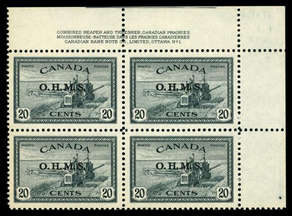 Official, 1949, 20c slate black 'O.H.M.S.' overprint (Scott O8), plate block of 6, o.g., never hinged, Extremely Fine. Scott $125. (Image)