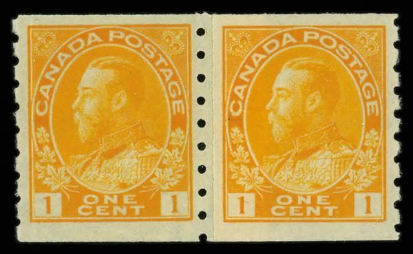 1923, King George V "Admiral" coil, 1¢ yellow, Die II, dry printing, perf. 8 vertically (Scott 126), paste-up pair, o.g., never hinged, Fine to Very Fine. Scott $95. (Image)