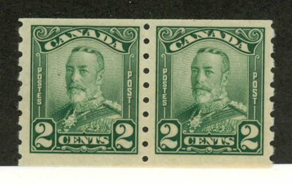 1929, King George V, 2¢ green coil (Scott 161), pair, o.g., never hinged, Fine to Very Fine. Scott $160. (Image)
