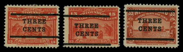 1919, 15c scarlet Seals surcharged new values in black (Scott 128-130), complete set of singles, o.g., hinged, Fine to Very Fine. Scott $249. (Image)