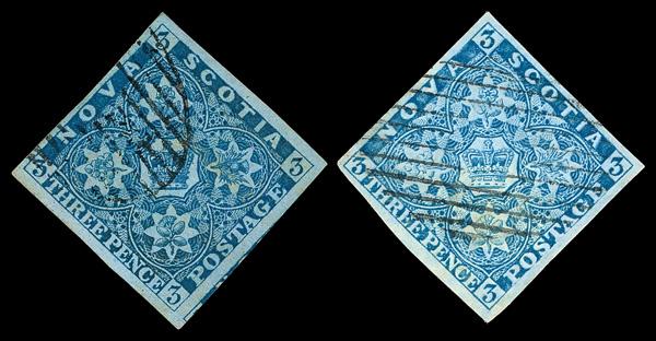1851-57, 3d bright blue & 3d pale blue (Scott 2), each shade attractive with solid margins and clean detail; #2 tiny thins, #2b lightened stain, otherwise Fine to Very Fine. Scott $500. (Image)