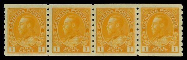 1923, King George V "Admiral" coil, 1¢ yellow, Die II, dry printing, perf. 8 vertically (Scott 126), 2 pairs of 2, o.g., never hinged. Scott $44. (Image)
