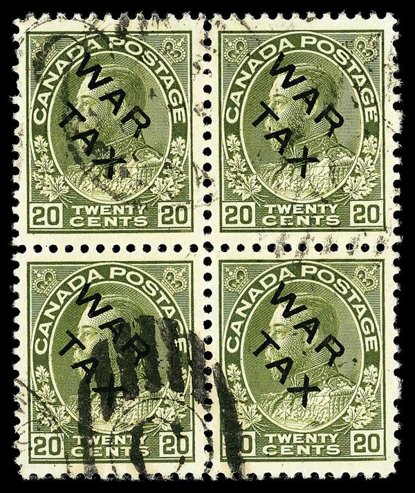 War Tax, 1915, 20¢ olive green, 2-line overprint, block of 4, fresh and well-centered with all perforations intact; Parcel Post use, Very Fine. Unitrade MR2C; C$600 as singles ($450). (Image)
