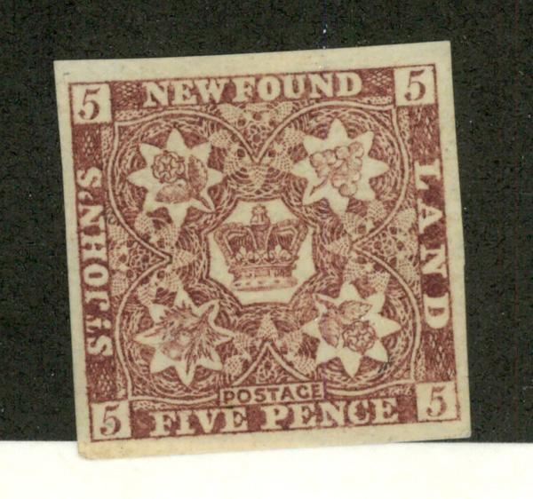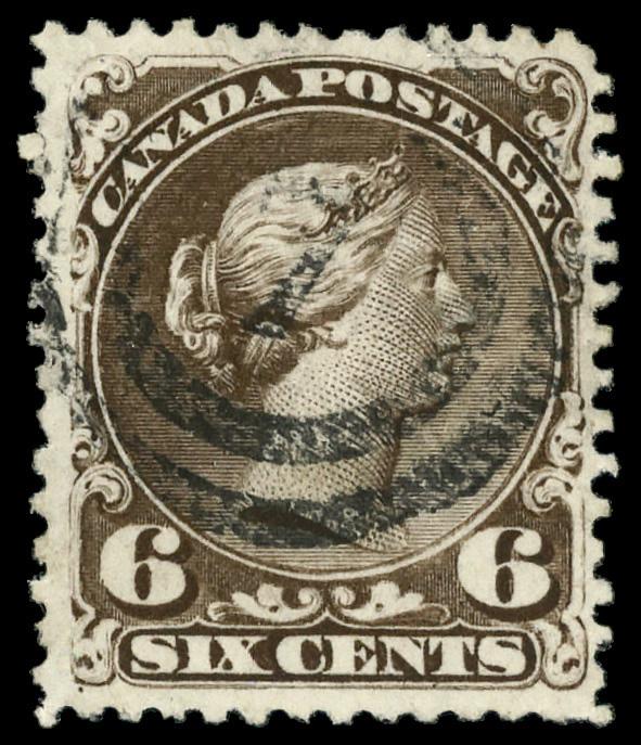 1868, Large Queen, 6¢ dark brown, Bothwell paper (Scott 27 var), paper 6, #7 St. John's cancel; slight tonig & reperfed, Very Fine. Unitrade 27vi; C$325 ($240). (Image)