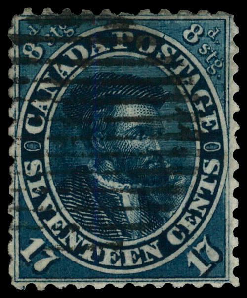 1859, Jacques Cartier, 17¢ blue (Scott 19); reperfed, Fine to Very Fine. Scott $225. (Image)