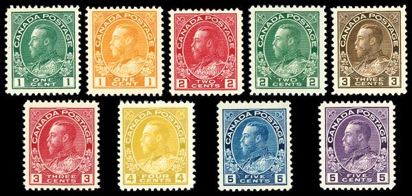 1912-25, King George V "Admiral", 1¢ to $1 complete (Scott 104-122), set of 18, o.g., never hinged (20¢-$1 part o.g.) (50¢ thin), Very Fine. Scott $2,663. (Image)