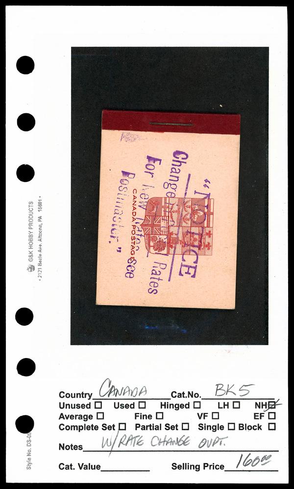 1912, King George V "Admiral", 2¢ carmine, booklet pane of 6 (Scott 106a), o.g., never hinged, Fine to Very Fine, BK5 with rate change overprinted on cover. Unitrade BK5e. Scott $250. (Image)