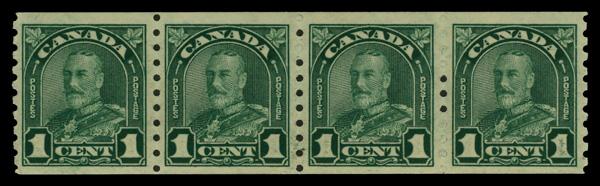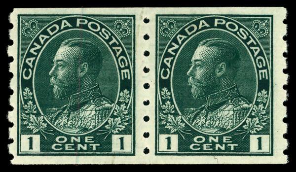1930, King George V "Maple Leaf", 1¢ deep green coil (Scott 179), 2 pairs, o.g., never hinged, Fine to Very Fine. Scott $65. (Image)