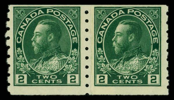 1922, King George V "Admiral" coil, 2¢ green, perf. 8 vertically (Scott 128), paste-up pair, o.g., never hinged, Fine to Very Fine. Scott $180. (Image)