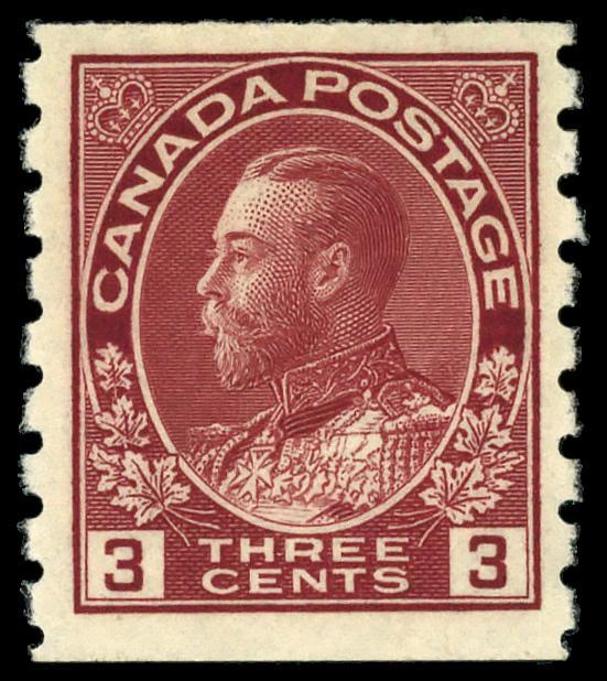 1924, King George V "Admiral" coil, 3¢ carmine, Die I, wet printing, perf. 8 vertically (Scott 130), o.g., lightly hinged, Fine to Very Fine. Scott $60. (Image)