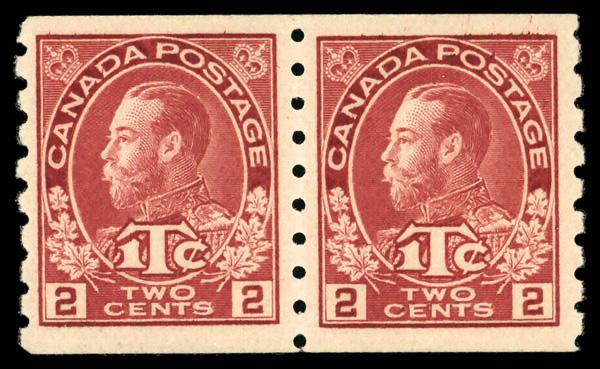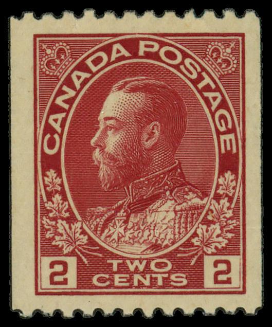 1915, King George V "Admiral", 2¢ carmine coil (Scott 132), single, o.g., never hinged, Fine to Very Fine. Scott $80. (Image)