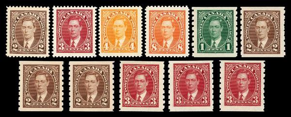 1937, King George VI first regular issue (Scott 232-234,236,238-240), singles and pairs, Great partial issue containing singles of 232-234, 236, 238-240 with 2 extras of 239 and 240 and pairs of 238-240., o.g., never hinged, Fine to Very Fine, 239 pair, right stamp has top right corner crease. SG 358-360/362/368-370; £219 ($280). Scott $117. (Image)