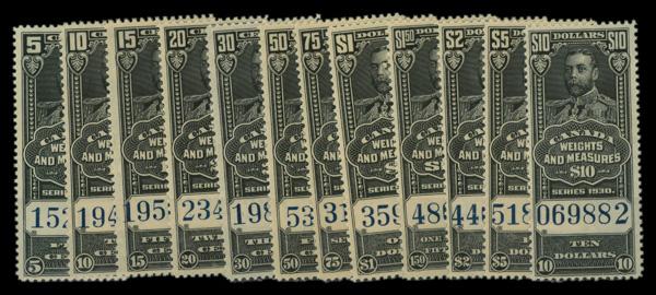 1930, Weights and Measures stamp complete, complete set of singles, o.g., never hinged, Fine to Very Fine. Van Dam FWM60-FWM71; C$90 ($70). (Image)