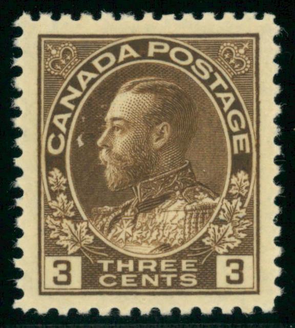 1918, King George V "Admiral", 3¢ brown, dry printing (Scott 108c), o.g., lightly hinged, Extremely Fine to Superb. Scott $35. (Image)