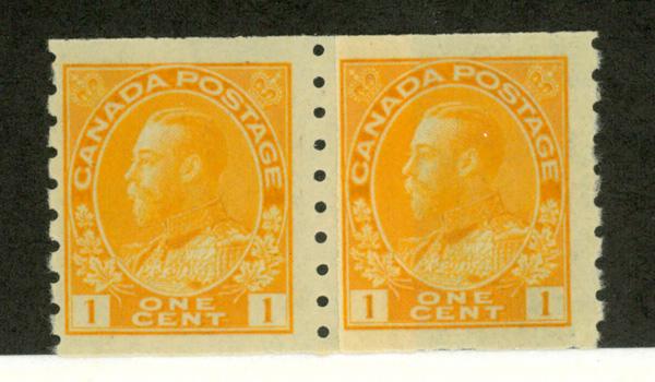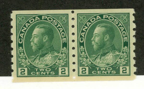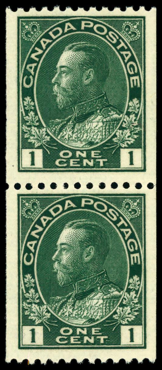 1915, King George V "Admiral", 1¢ dark green coil (Scott 131), pair, o.g., never hinged, Very Fine. Scott $43. (Image)