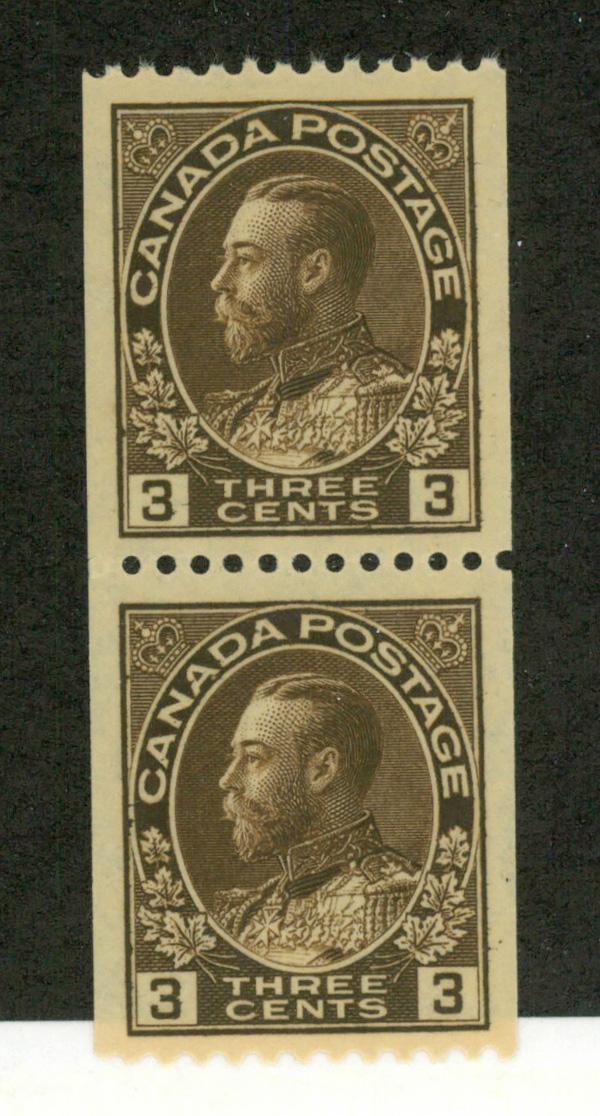 1921, King George V "Admiral", 3¢ brown coil (Scott 134), pair, o.g., never hinged, Fine to Very Fine. Scott $50. (Image)